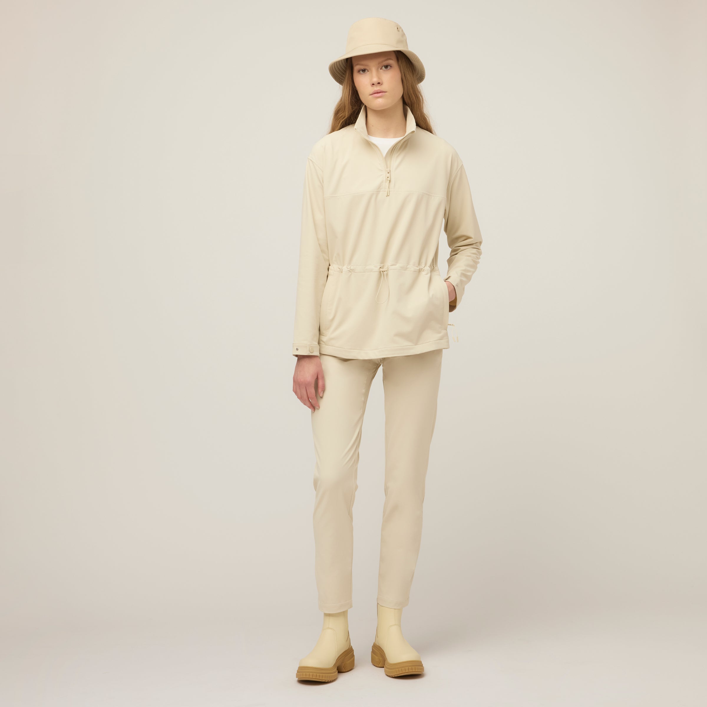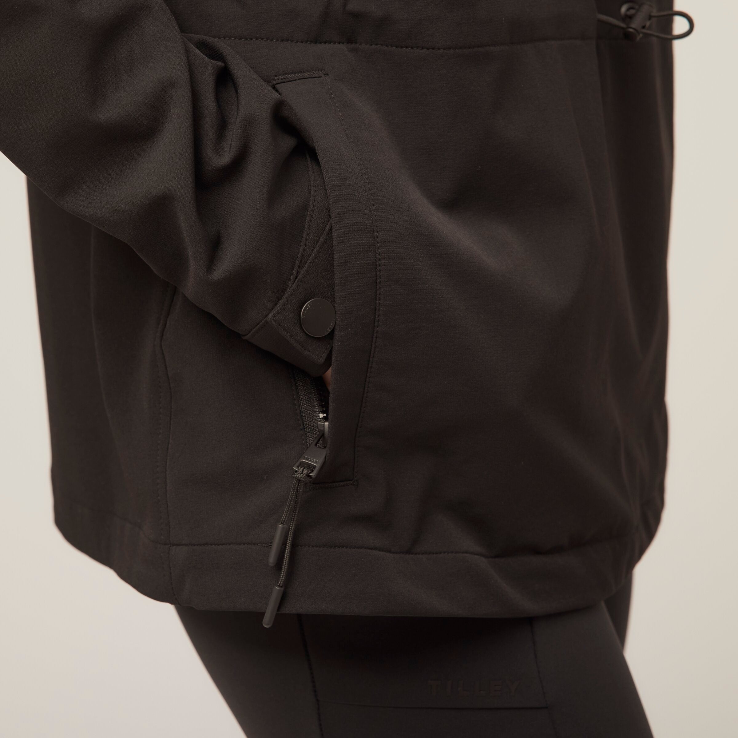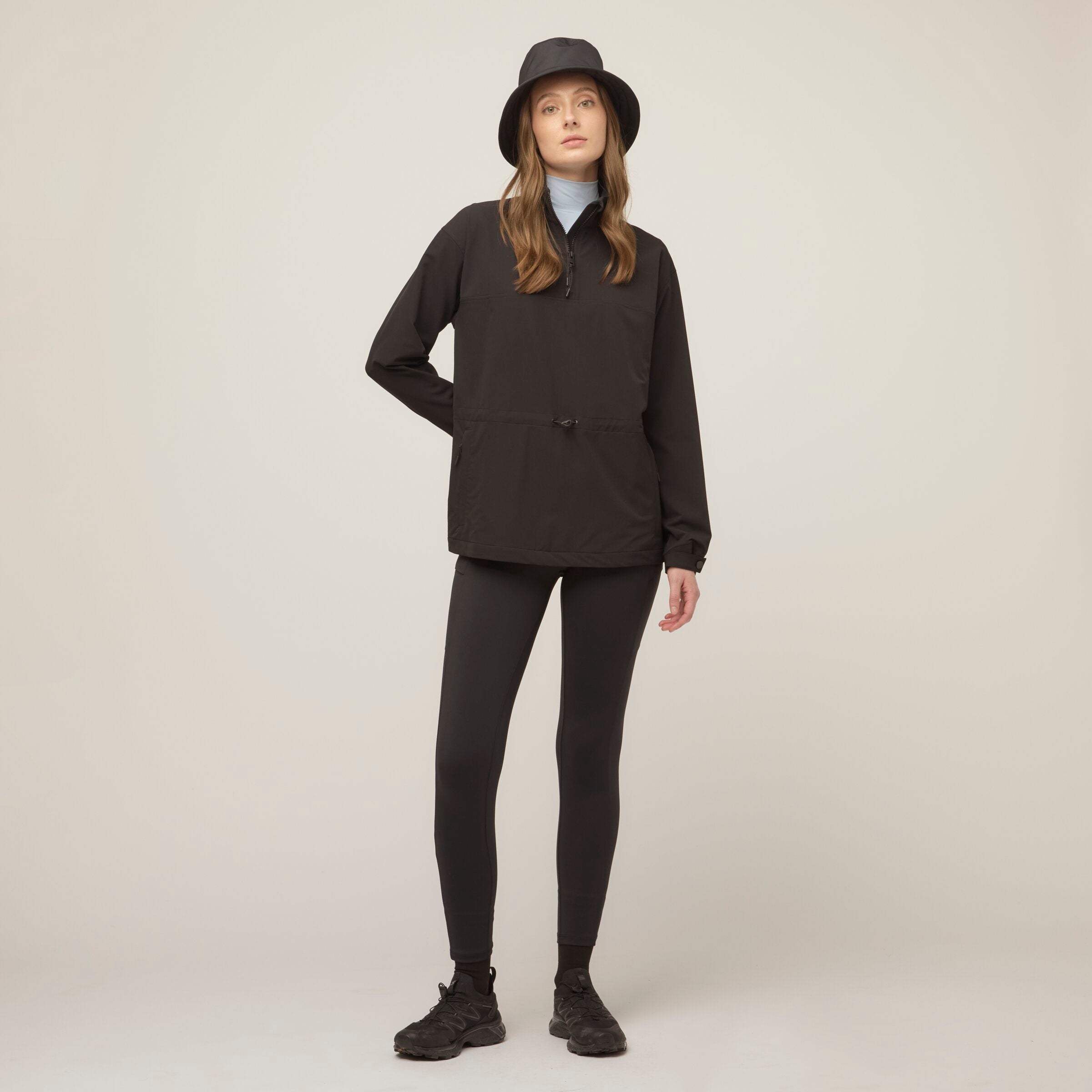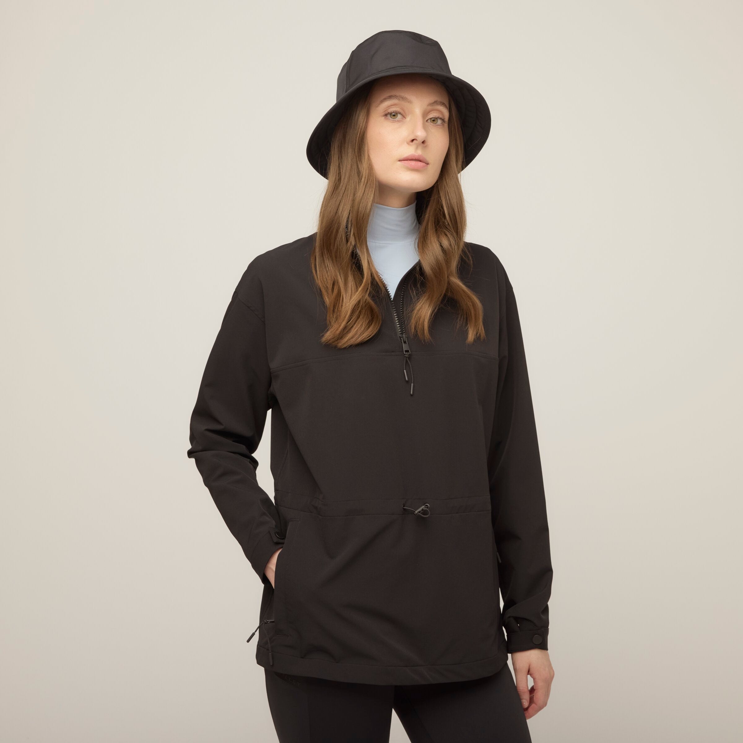 Double weave fabric gives this anorak extraordinary durability and resistance to both wind and water without compromising essential comfort. Four way stretch accommodates a full range of movement while the bungee waist can be adjusted for a more fitted or relaxed silhouette. The high neck collar keeps the wind out and can offer additional ventilation when unzipped.