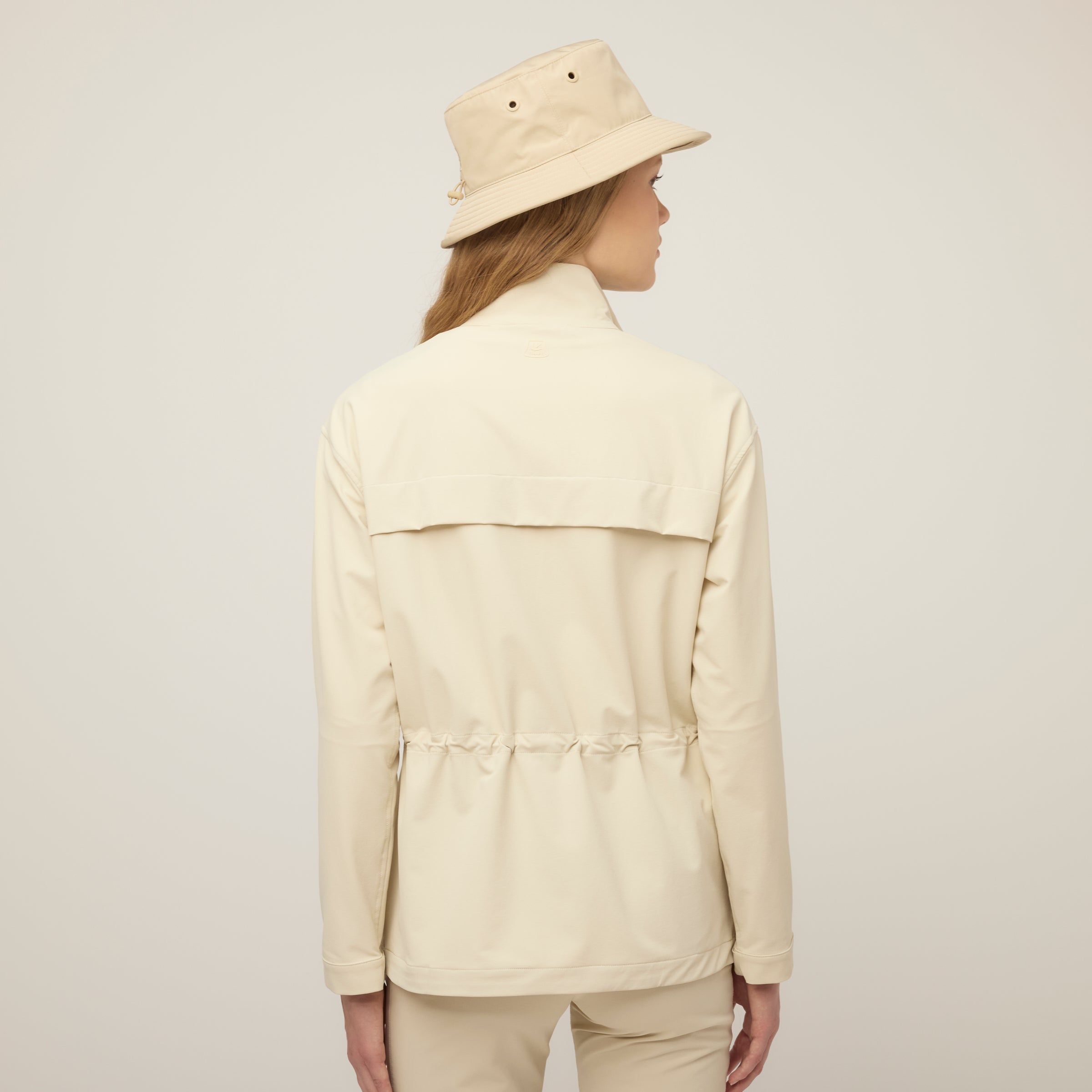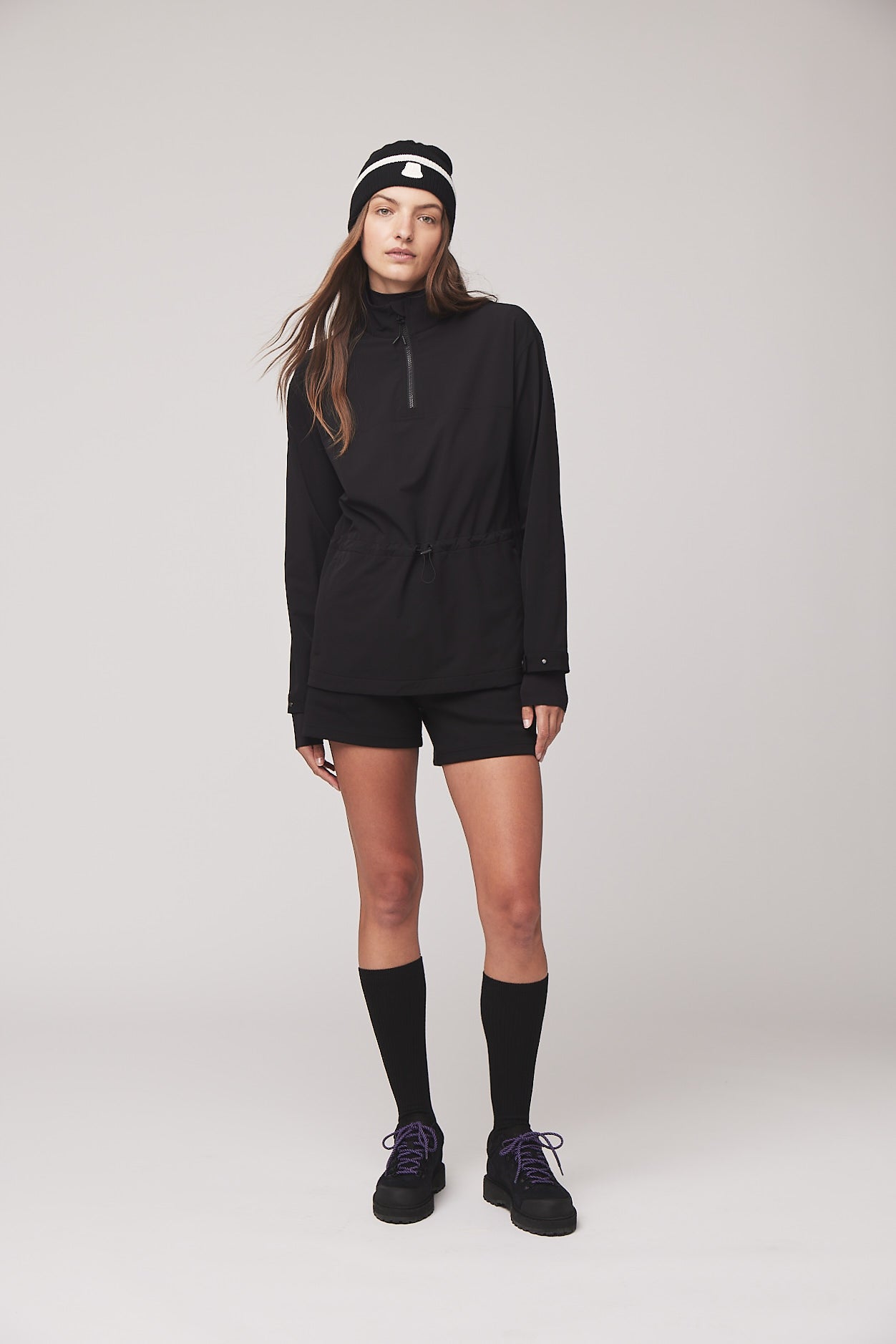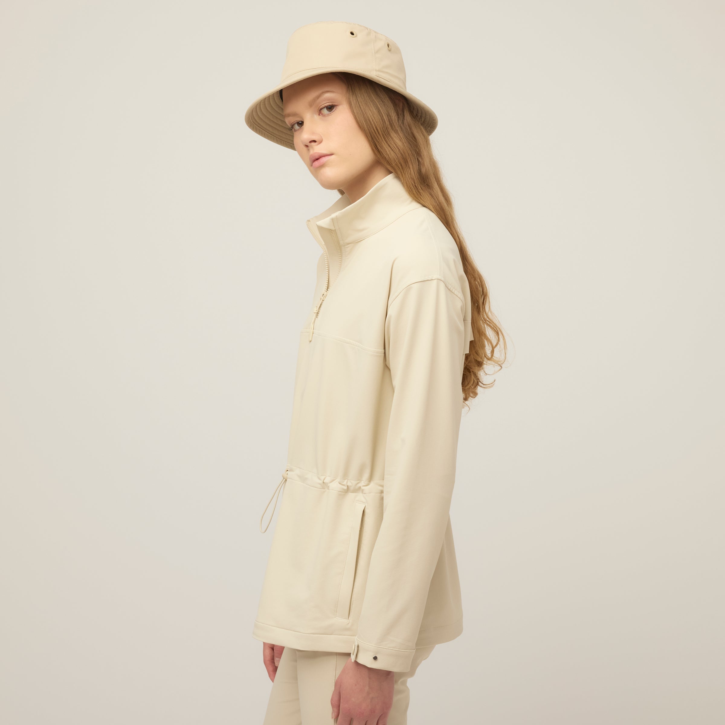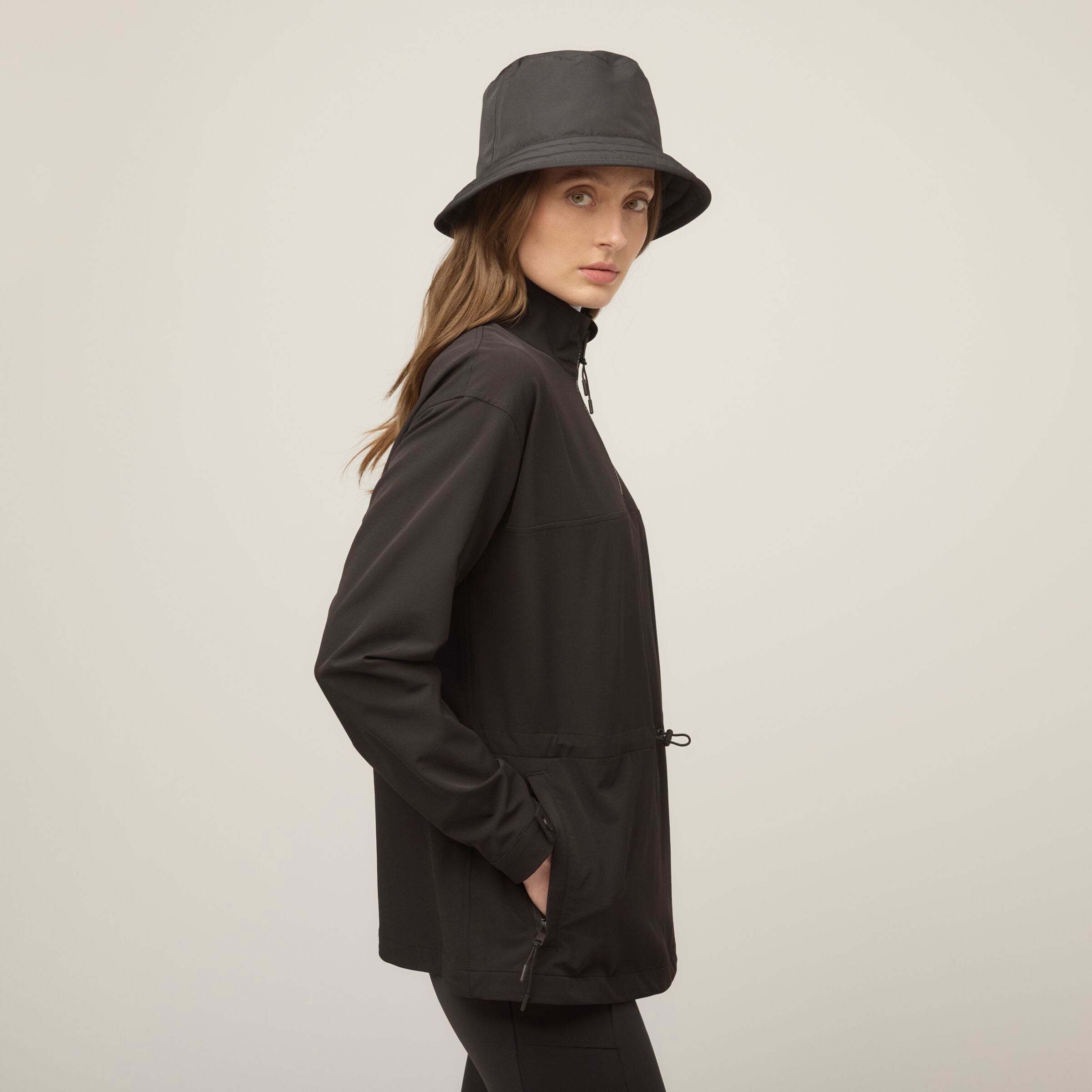 Double weave fabric gives this anorak extraordinary durability and resistance to both wind and water without compromising essential comfort. Four way stretch accommodates a full range of movement while the bungee waist can be adjusted for a more fitted or relaxed silhouette. The high neck collar keeps the wind out and can offer additional ventilation when unzipped.